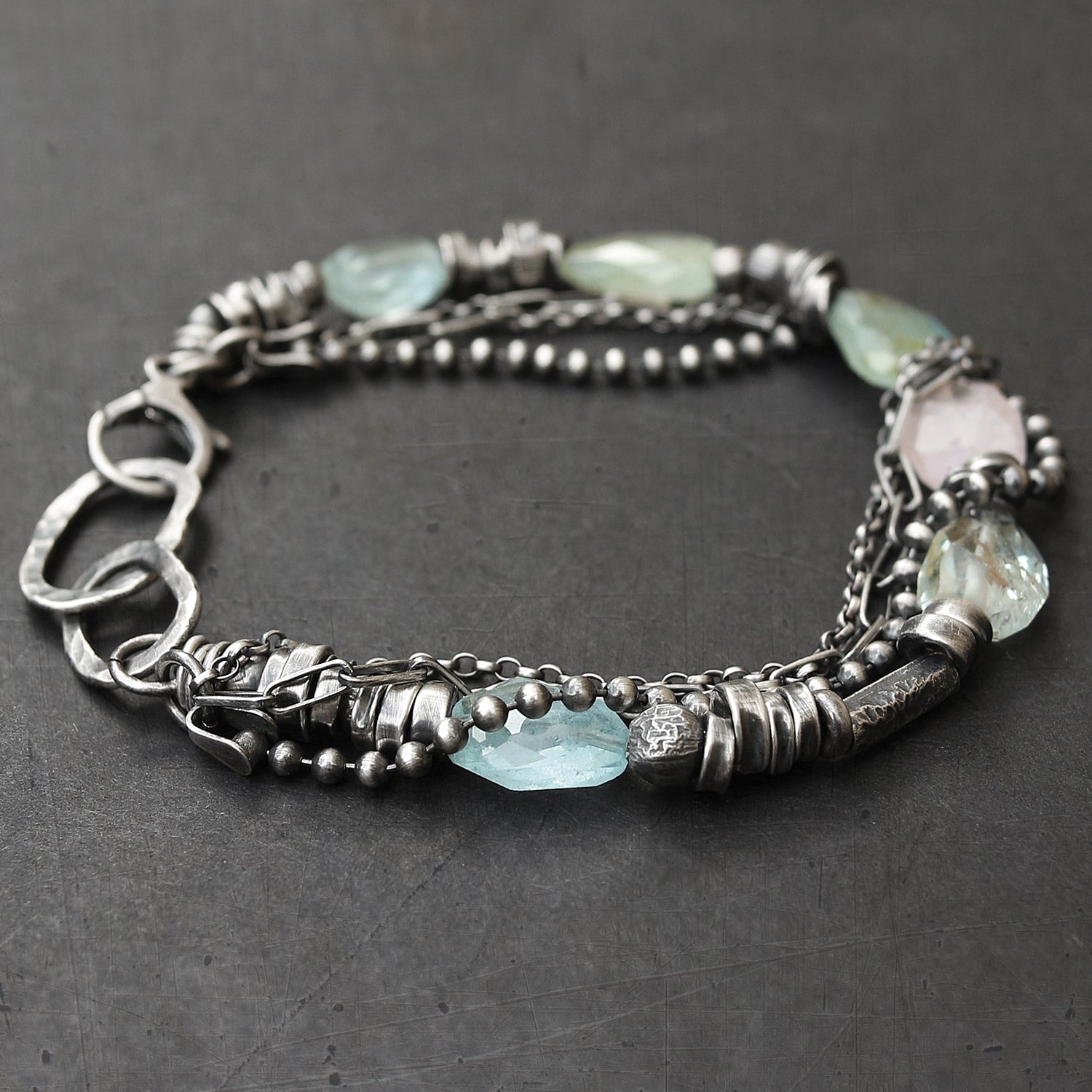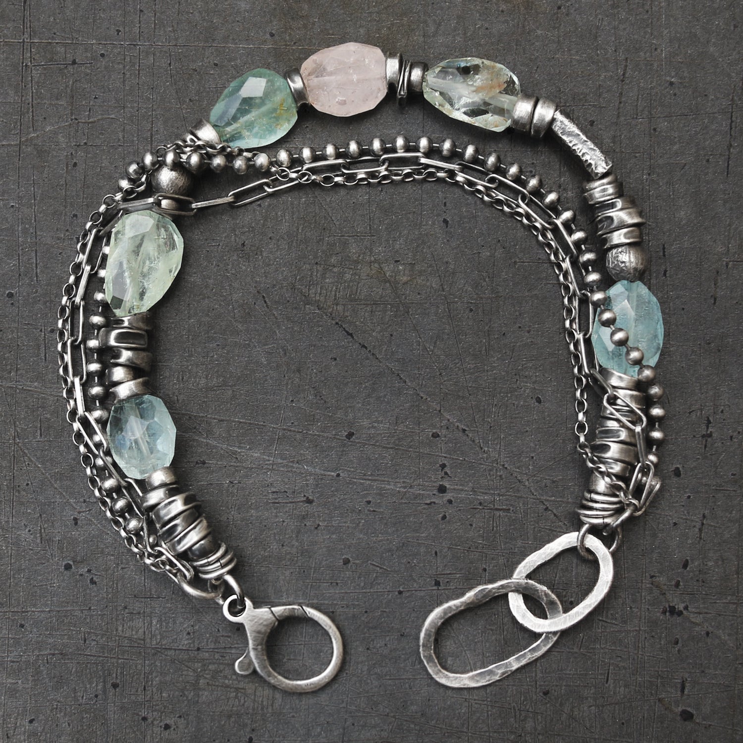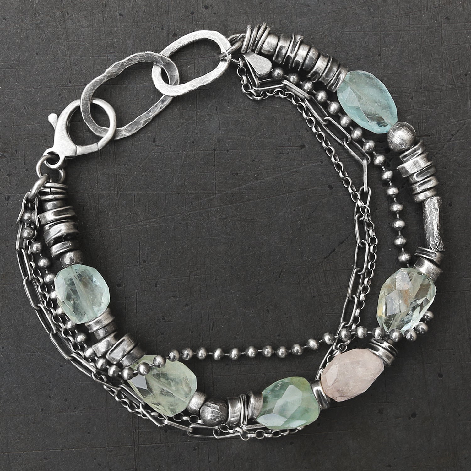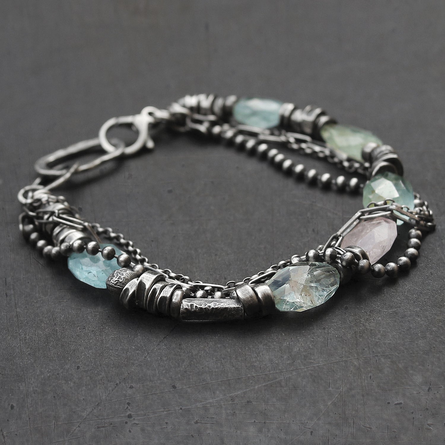 - Made of pale blue, green and pink aquamarine beads and oxidised sterling silver (925)