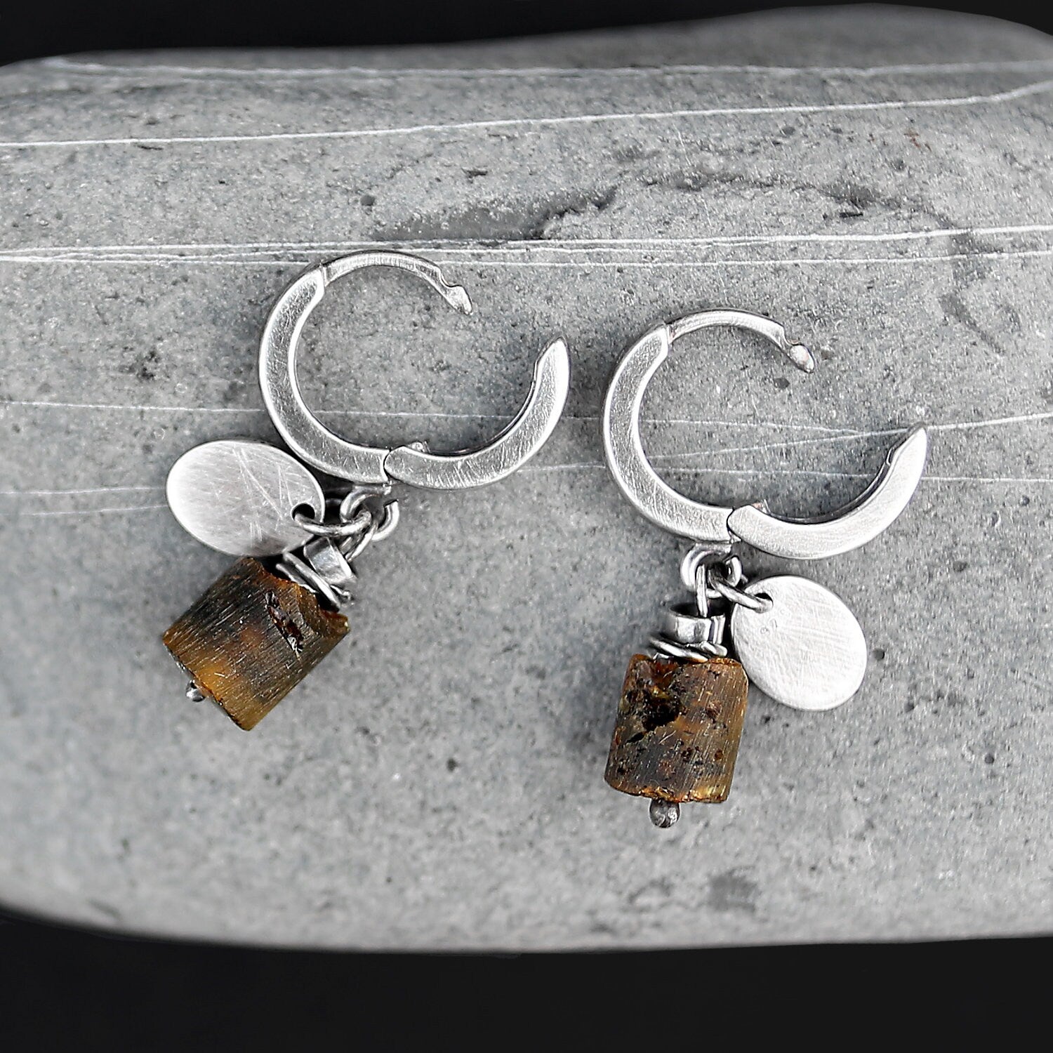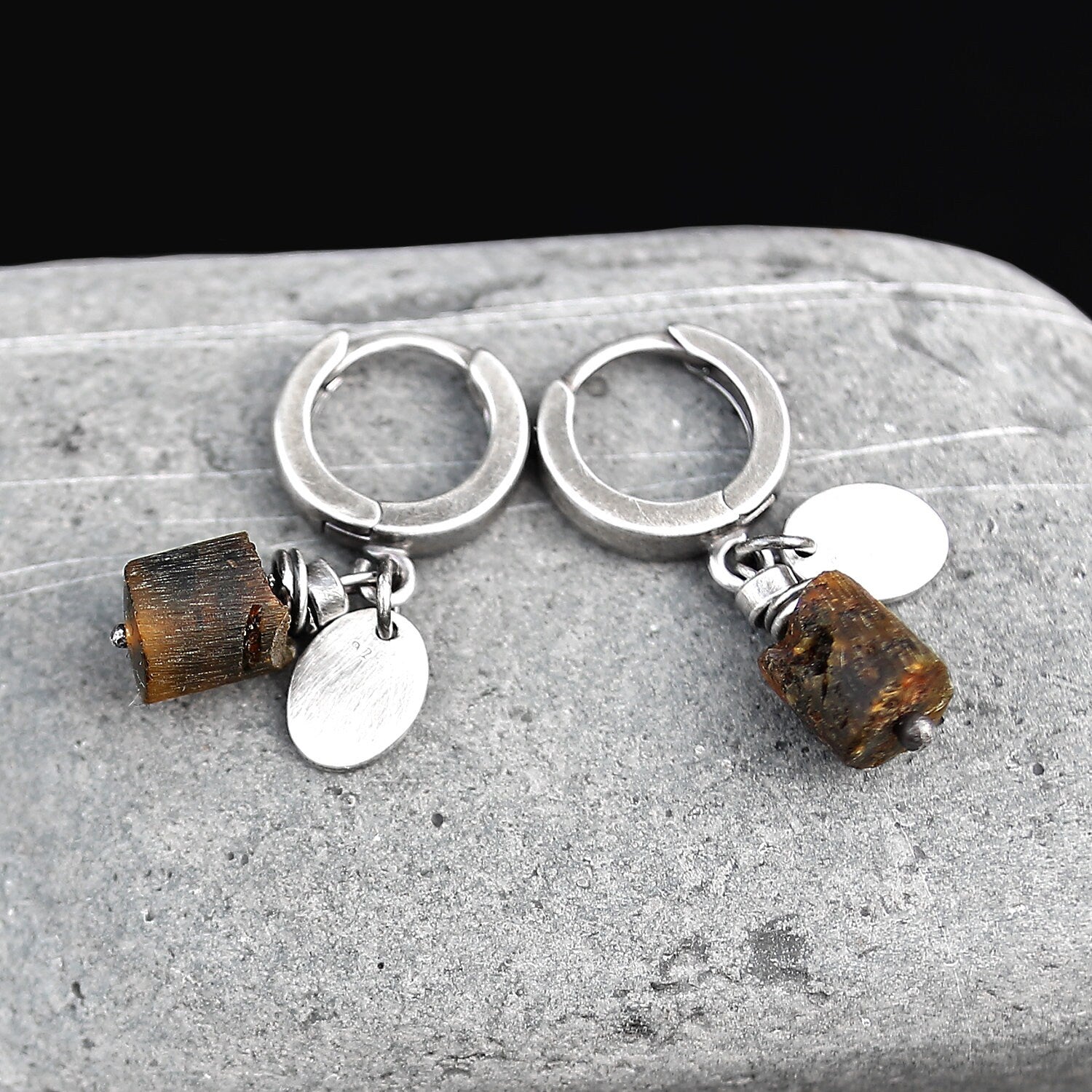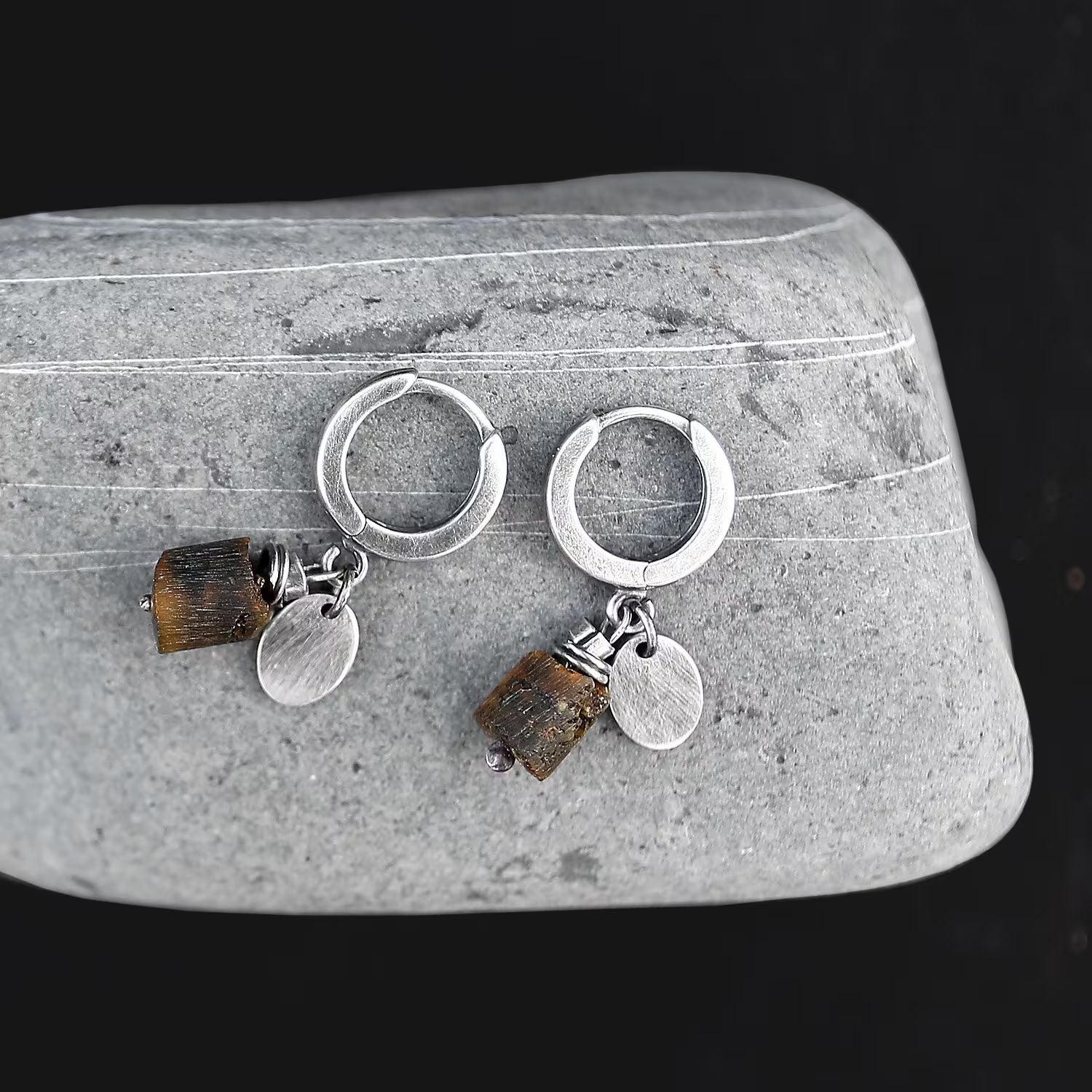 - Oxidised sterling silver and unpolished, brown baltic amber earrings