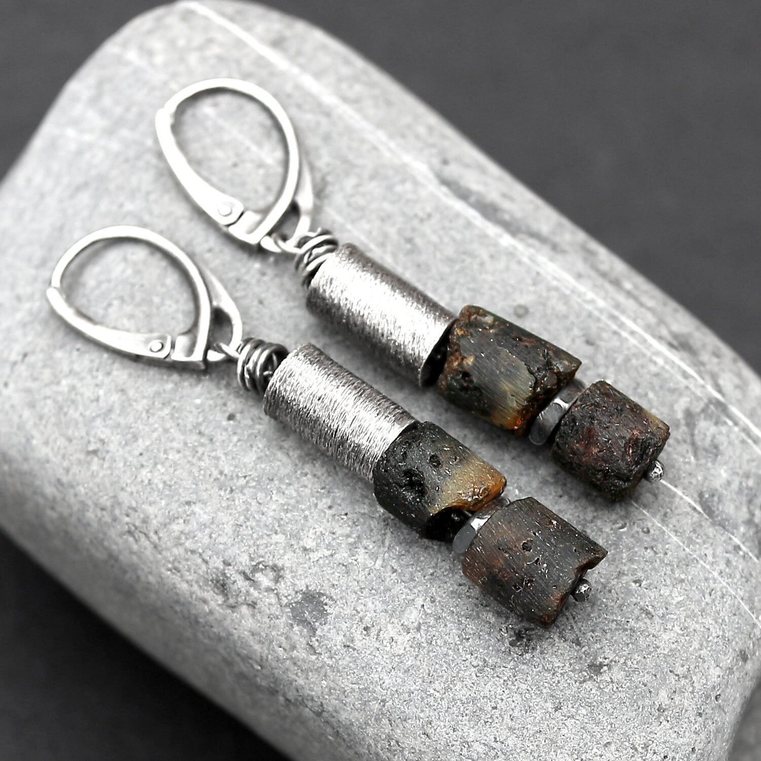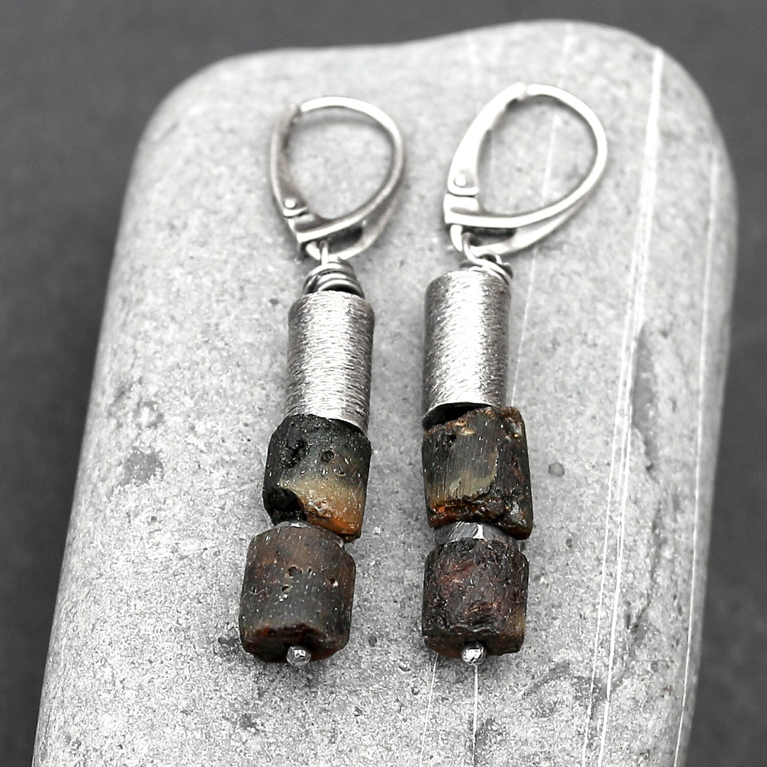 Dark Amber, Sterling Silver & Brushed Tube Dangle Earrings