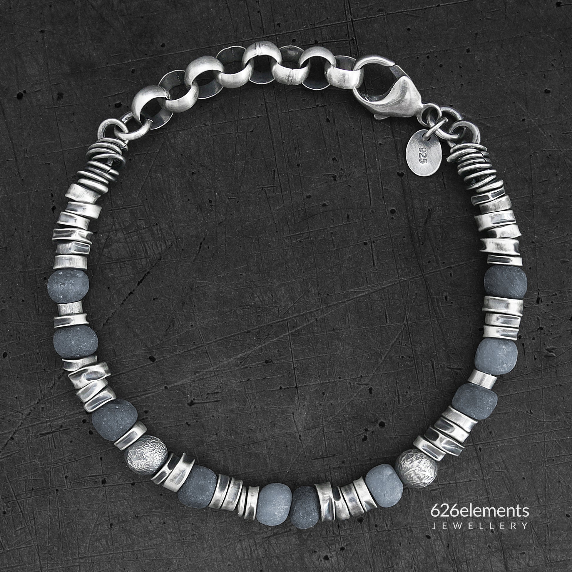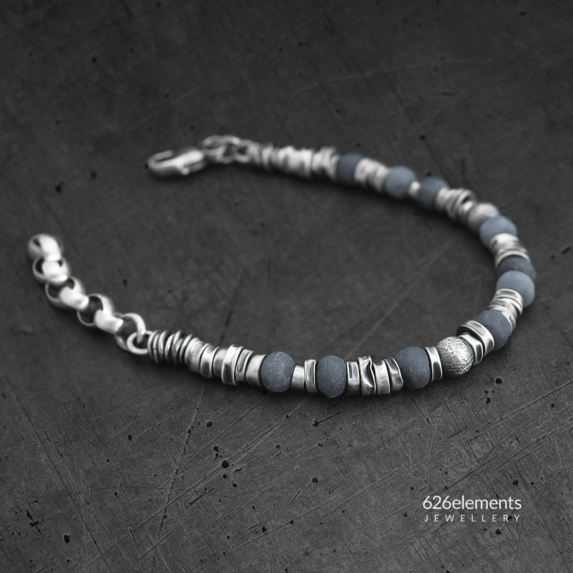 - Men's bracelet handcrafted from oxidised (blackened and polished) sterling silver and various shades of natural blue sapphires