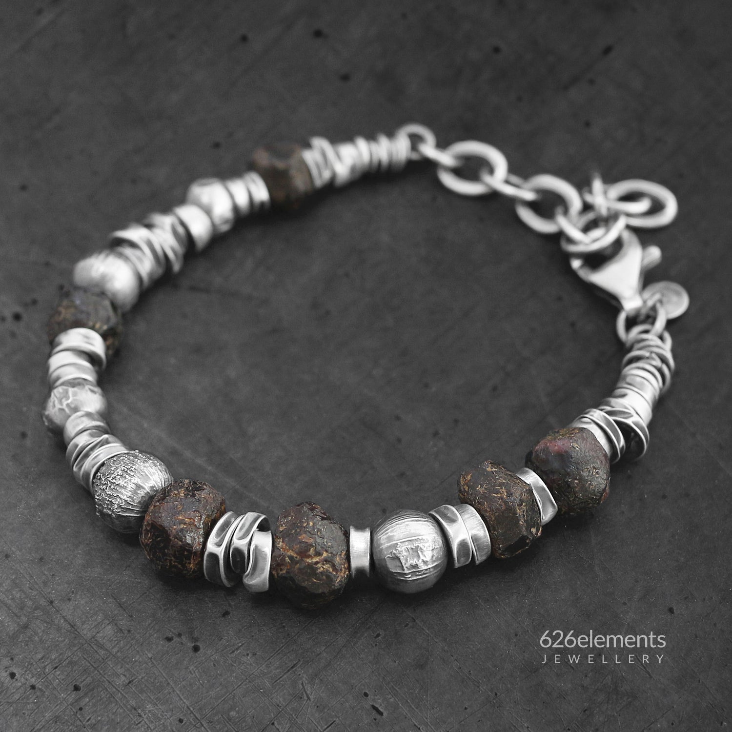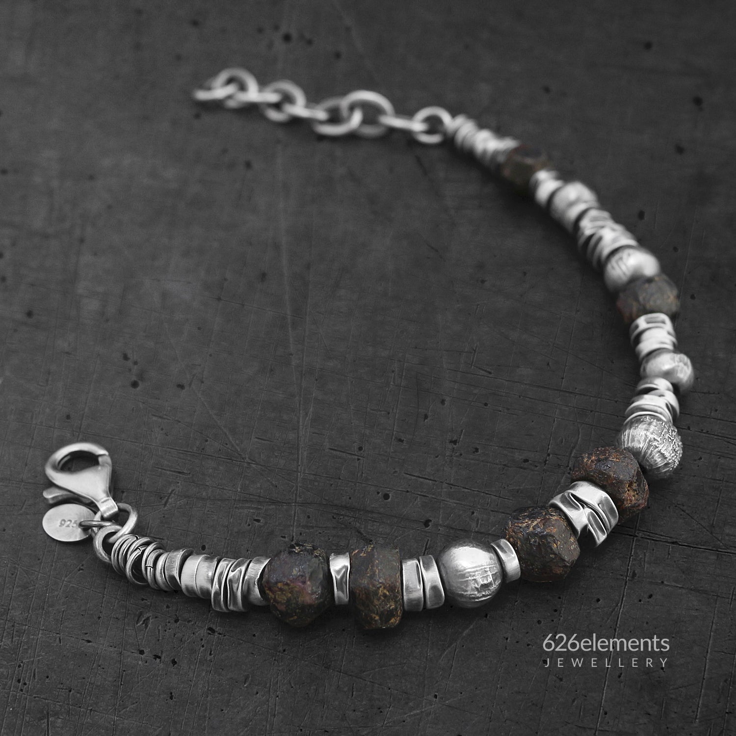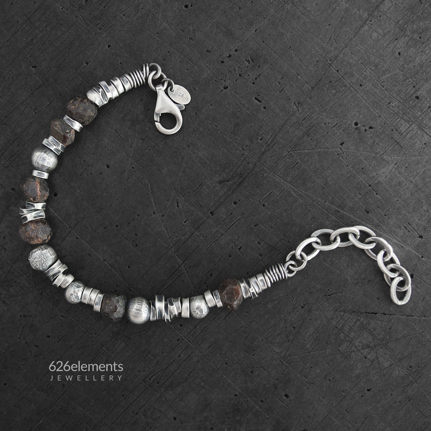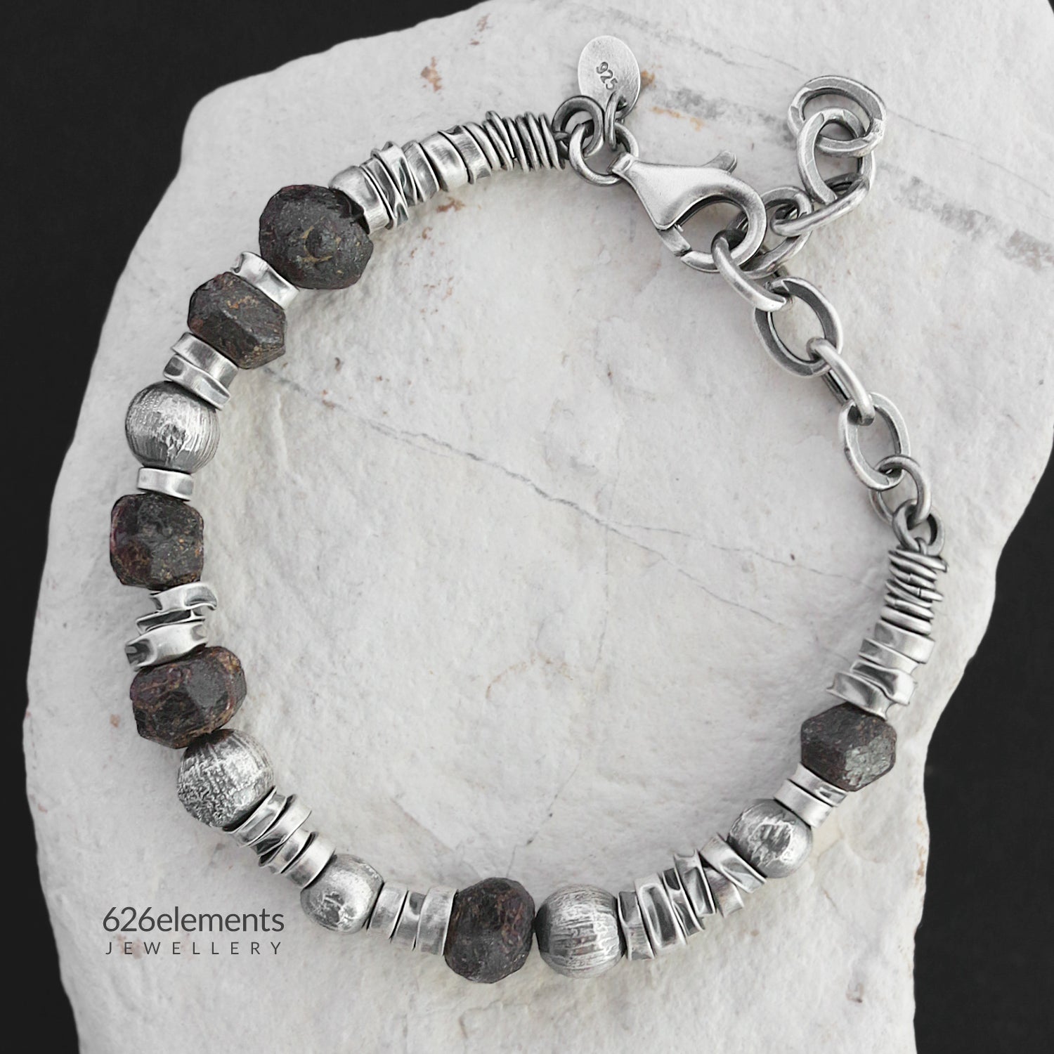 - Made of natural, unpolished, dark black-brown garnets and oxidised sterling silver