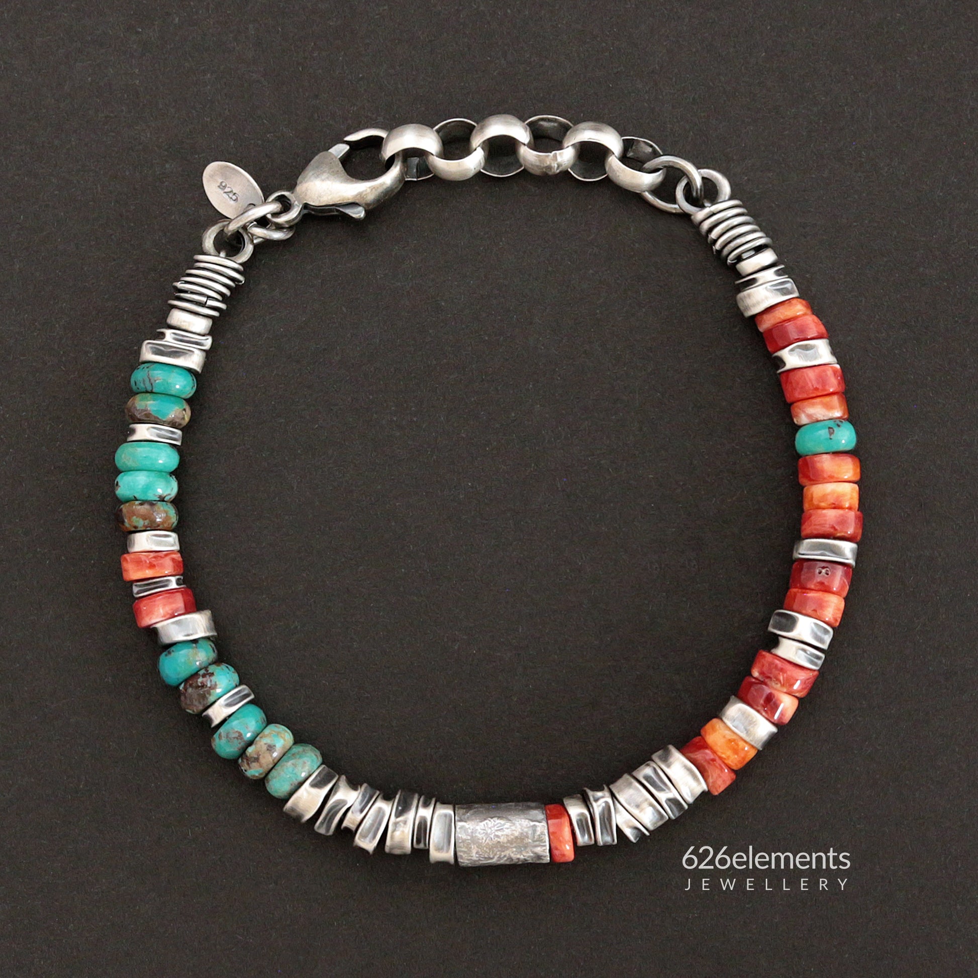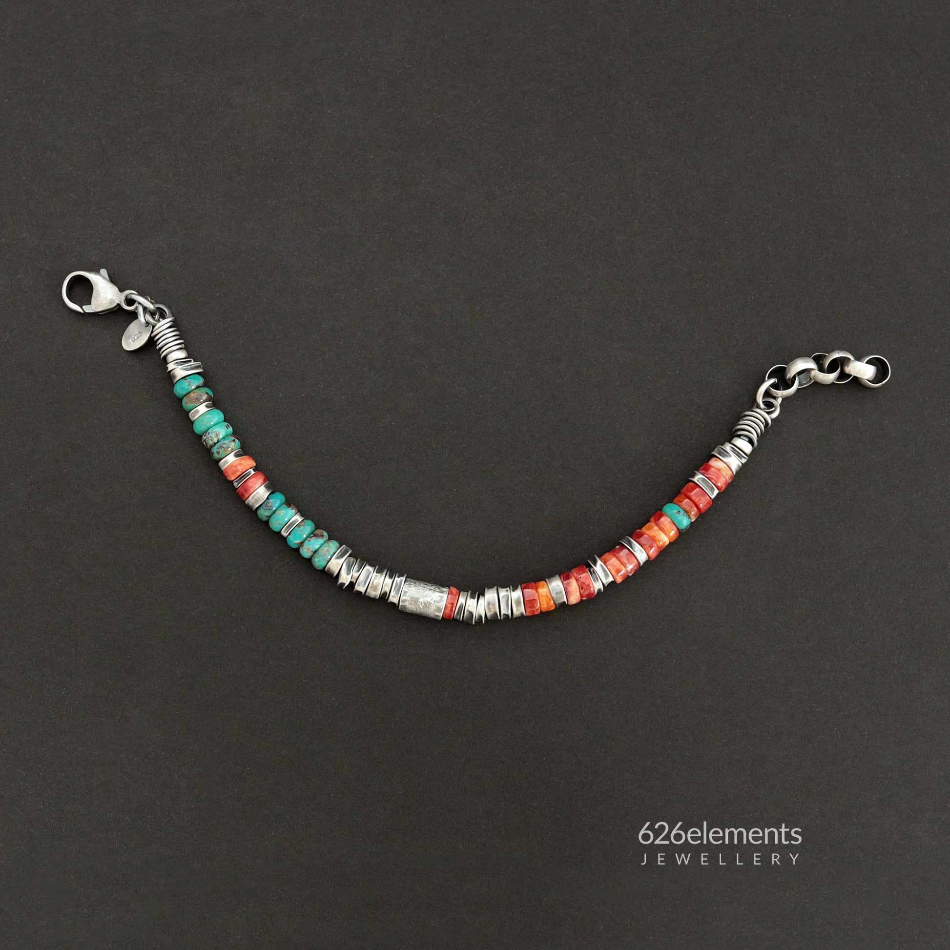Red Spiny Oyster, Green Turquoise & Oxidised Sterling Silver Bracelet