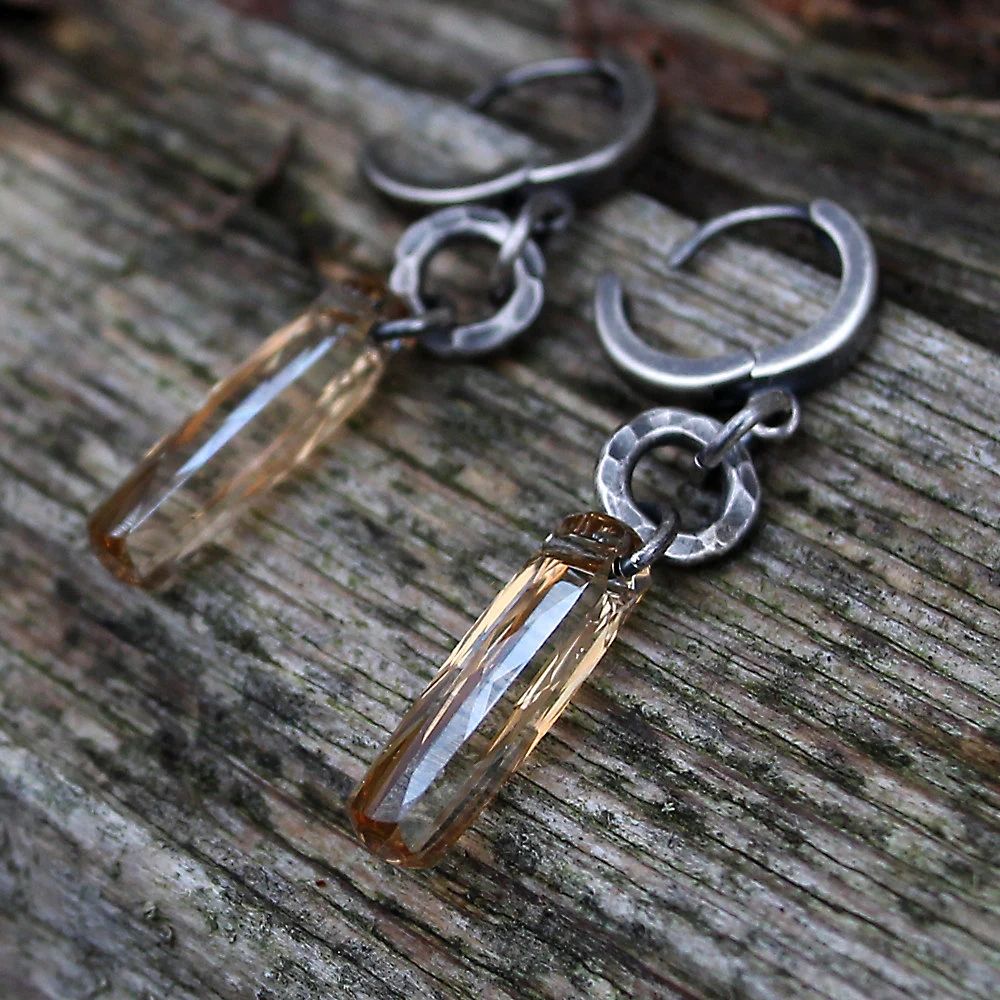 Swarovski Crystal Column & Hammered Fine Silver Circle Dangle Earrings