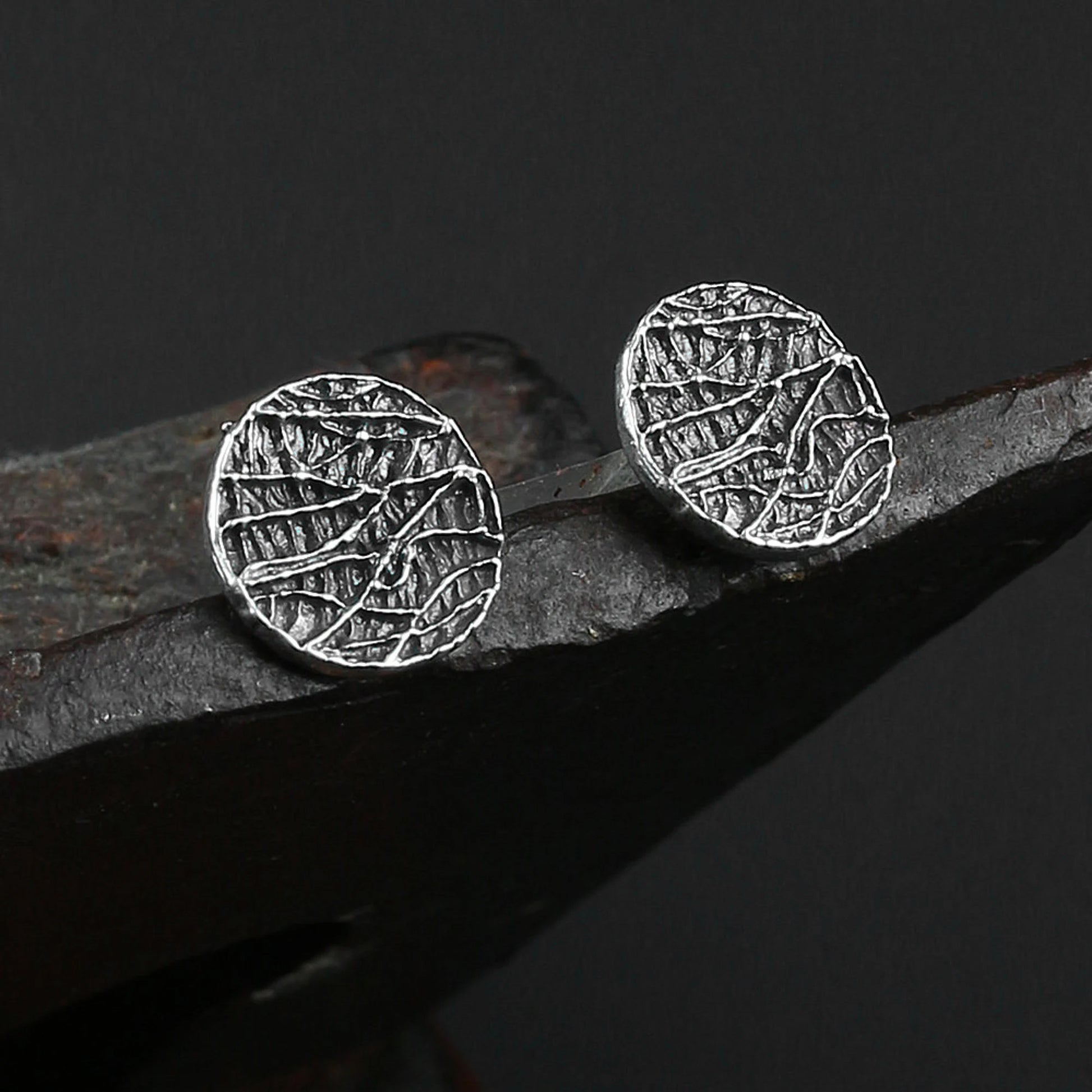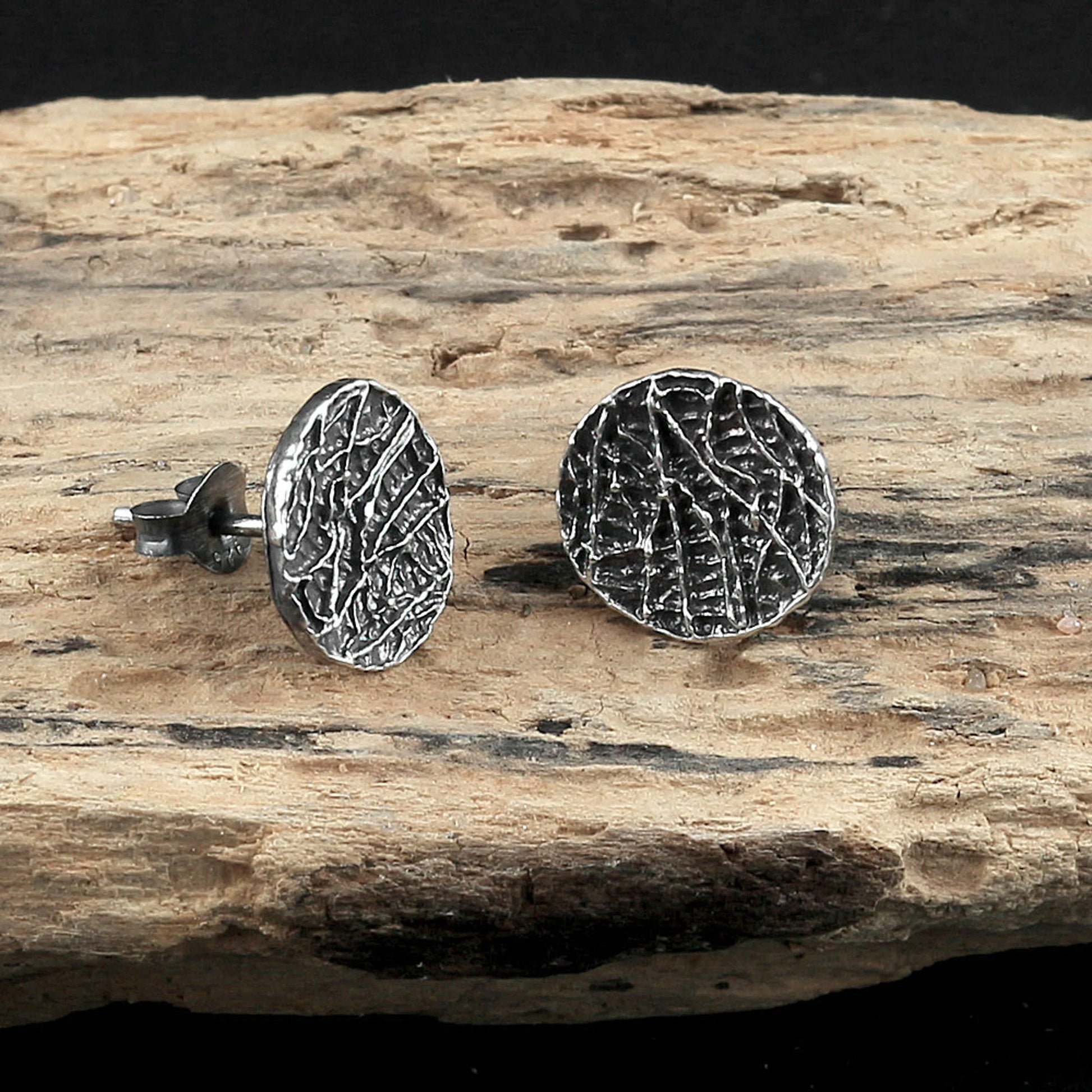 Lightweight and comfortable oxidised raw sterling silver stud round earrings.